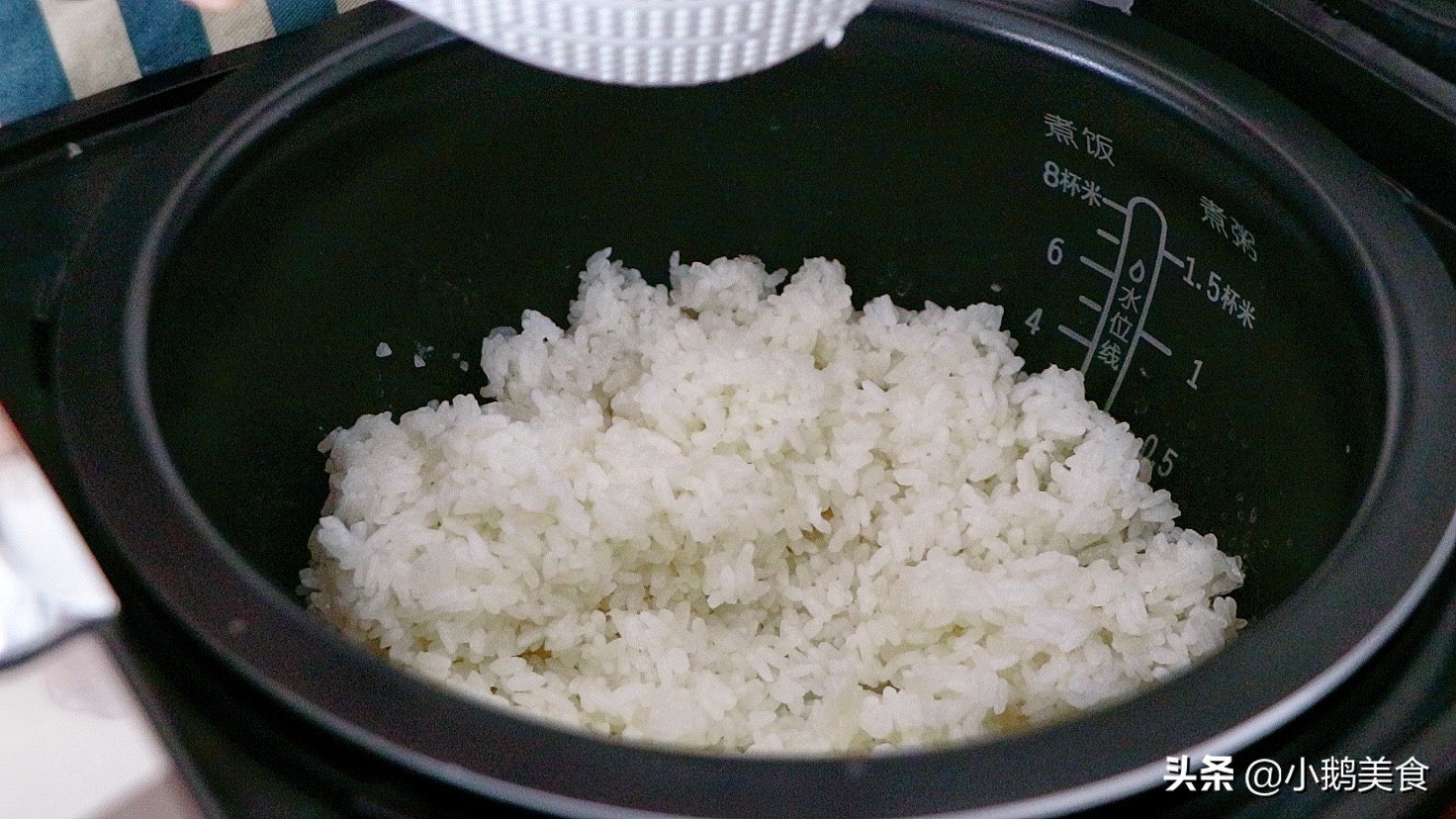 1、用量米的杯子,准备2杯糯米,洗净放入电饭煲中,加入比平时稍微少一点的水,把糯米煮熟,煮的稍干一些。煮好后拨散稍微冷一下。