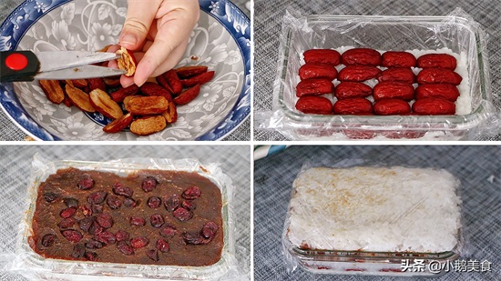 2、取一个模具,铺一层保鲜膜,放一层糯米压结实,摆一层去核红枣,再铺一层糯米压结实,再铺一层红豆沙,豆沙上可以加一点蔓越莓或葡萄干,酸酸甜甜的更好吃。最上层再铺一层糯米压实。