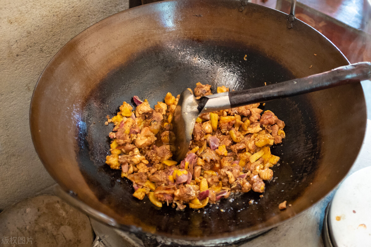 第二步,准备锅和色拉油,开大火。当锅温度升高后,将鸡肉逐个加入锅中炒至变成金黄色。此时可以将鸡肉捞起,备用。