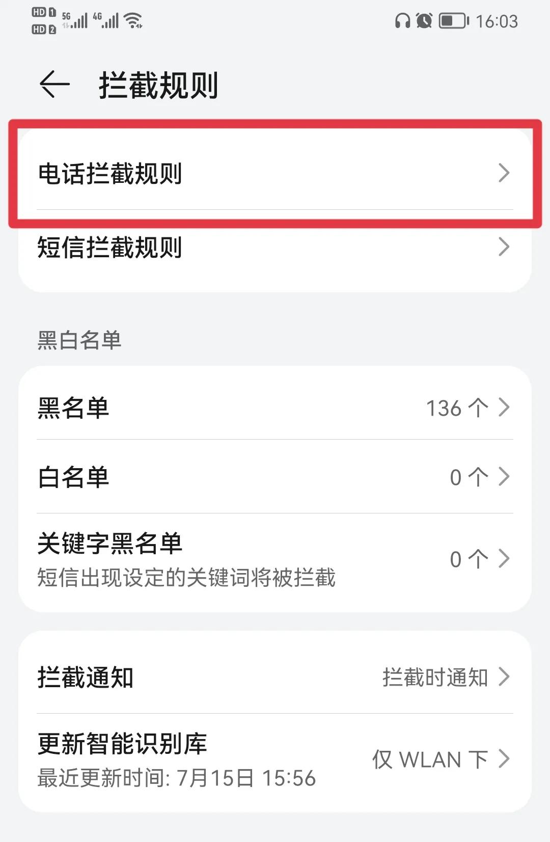 4、在“拦截规则”功能界面,点击“电话拦截规则”后面>符号,如下图: