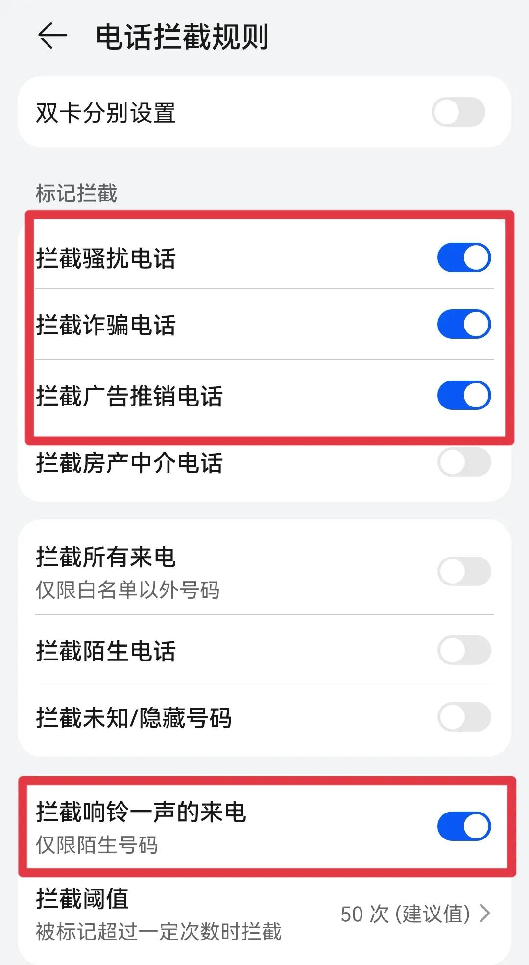 5、在“电话拦截规则”窗口,根据自己需求分别开启“拦截骚扰电话”、“拦截诈骗电话”、“拦截广告推销电话”、“拦截响铃一声的来电”等等功能,到此即完成了设置操作,如下图: