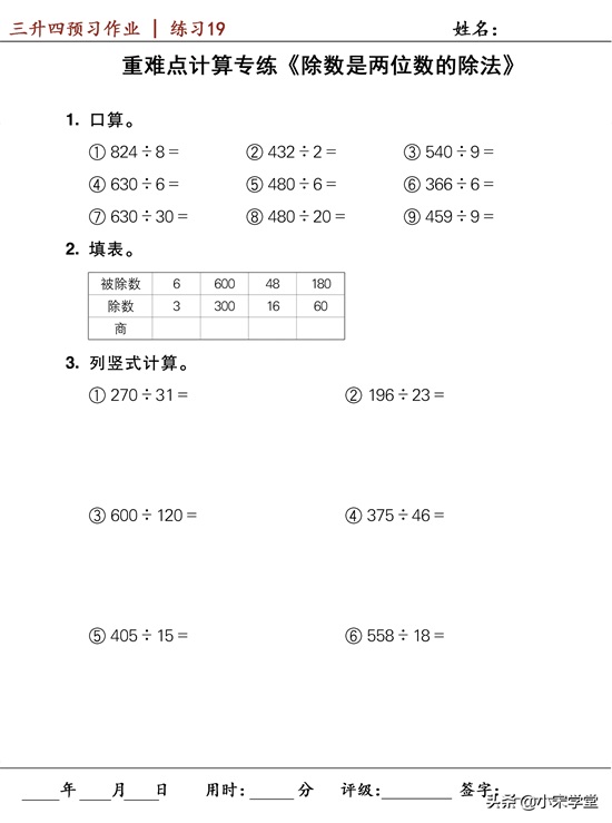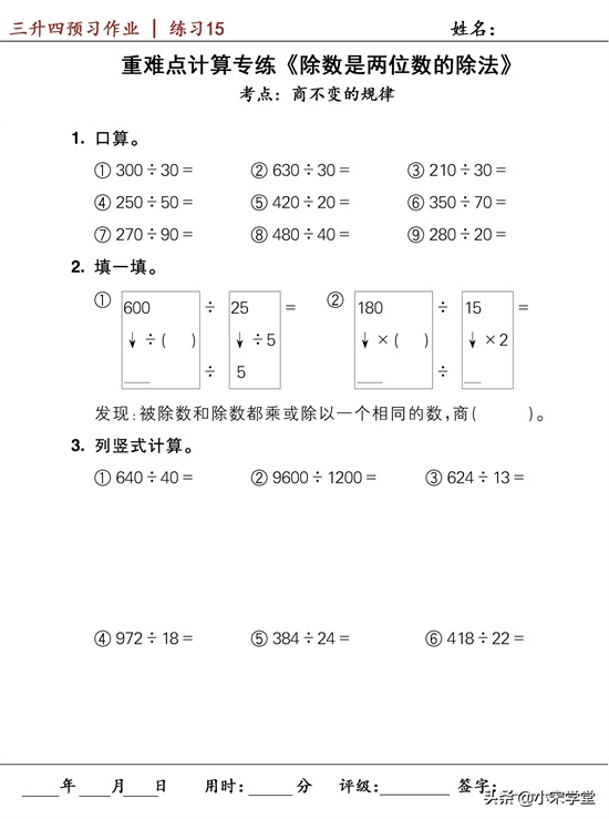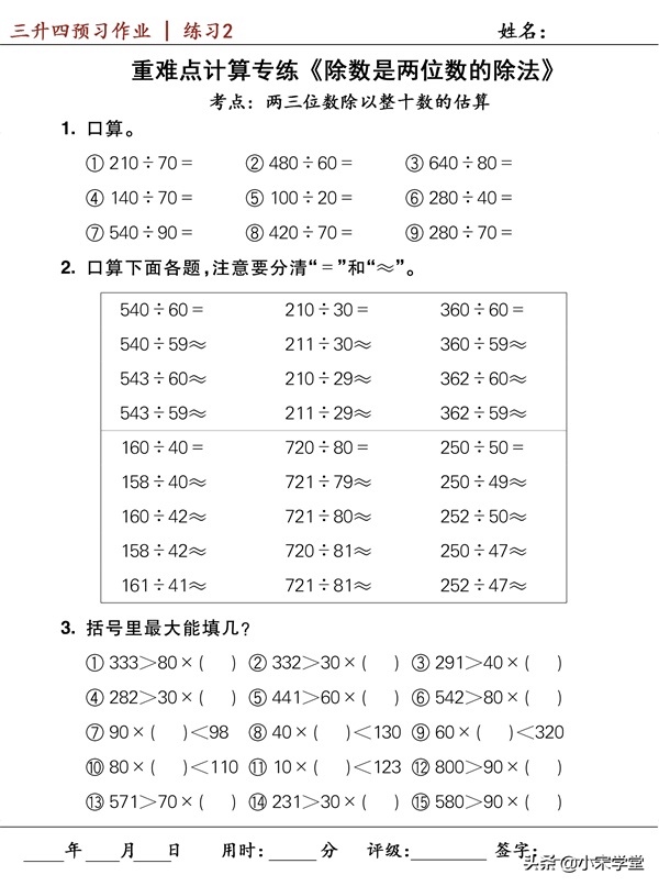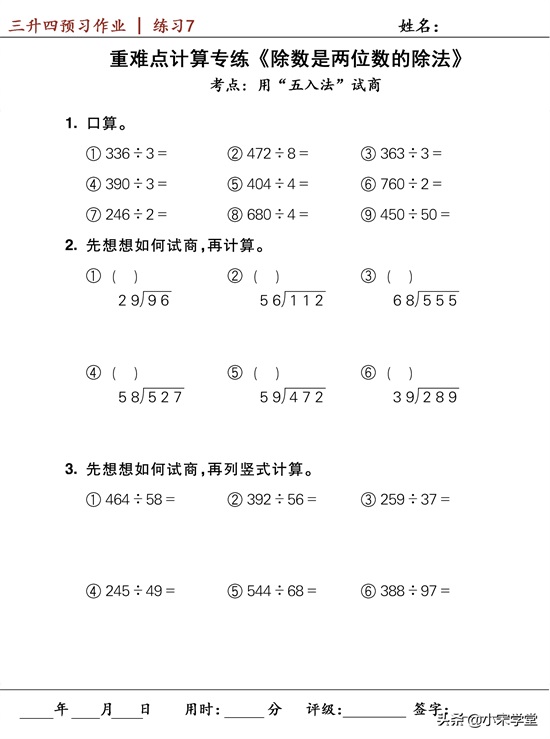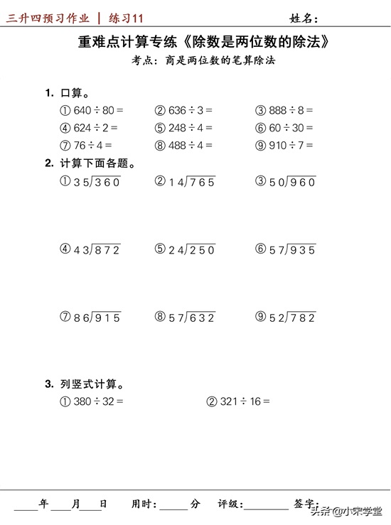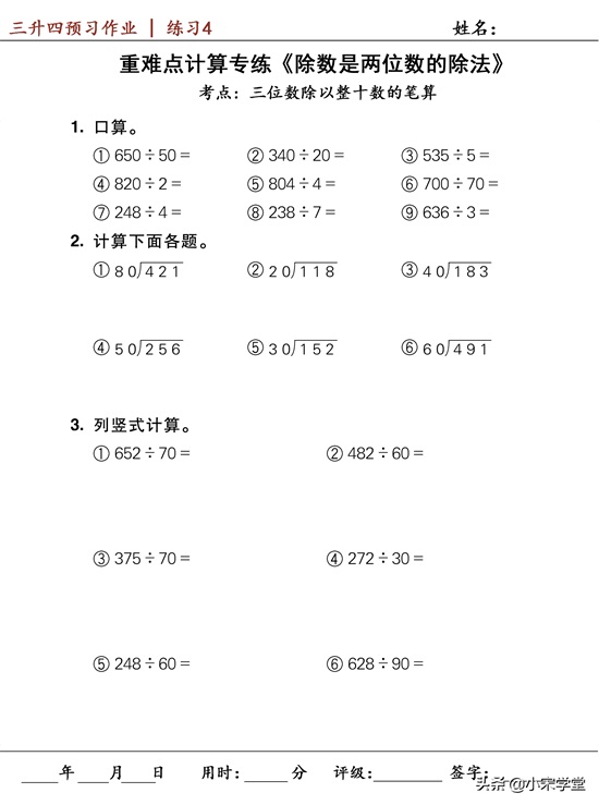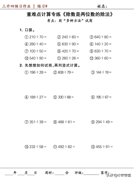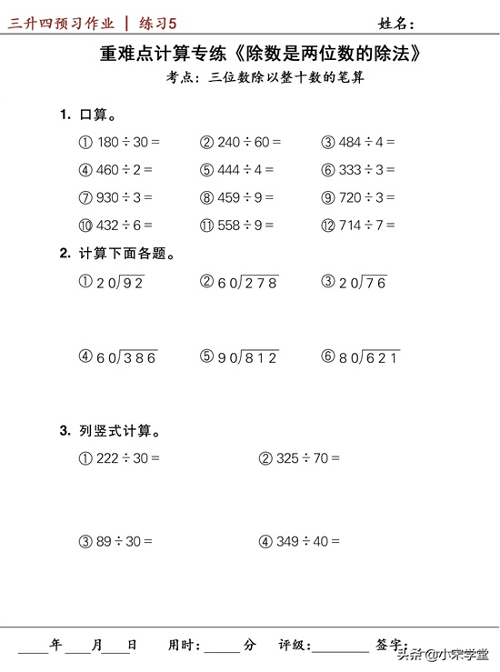 三升四的孩子们暑假或开学要着重预习四年级上册数学重难点计算内容,尤其是《除数是两位数的除法》(有答案),下面这套计算专练习题囊括新学期要考的所有相关内容。涉及的考点知识包括:两三位数除以两位数的口算及估算、两三位数除以整十数的估算和笔算、用“四舍五入法或多种方法”试商、商是两位数的笔算除法、商不变和商随被除数变化的规律等。详情如下:
