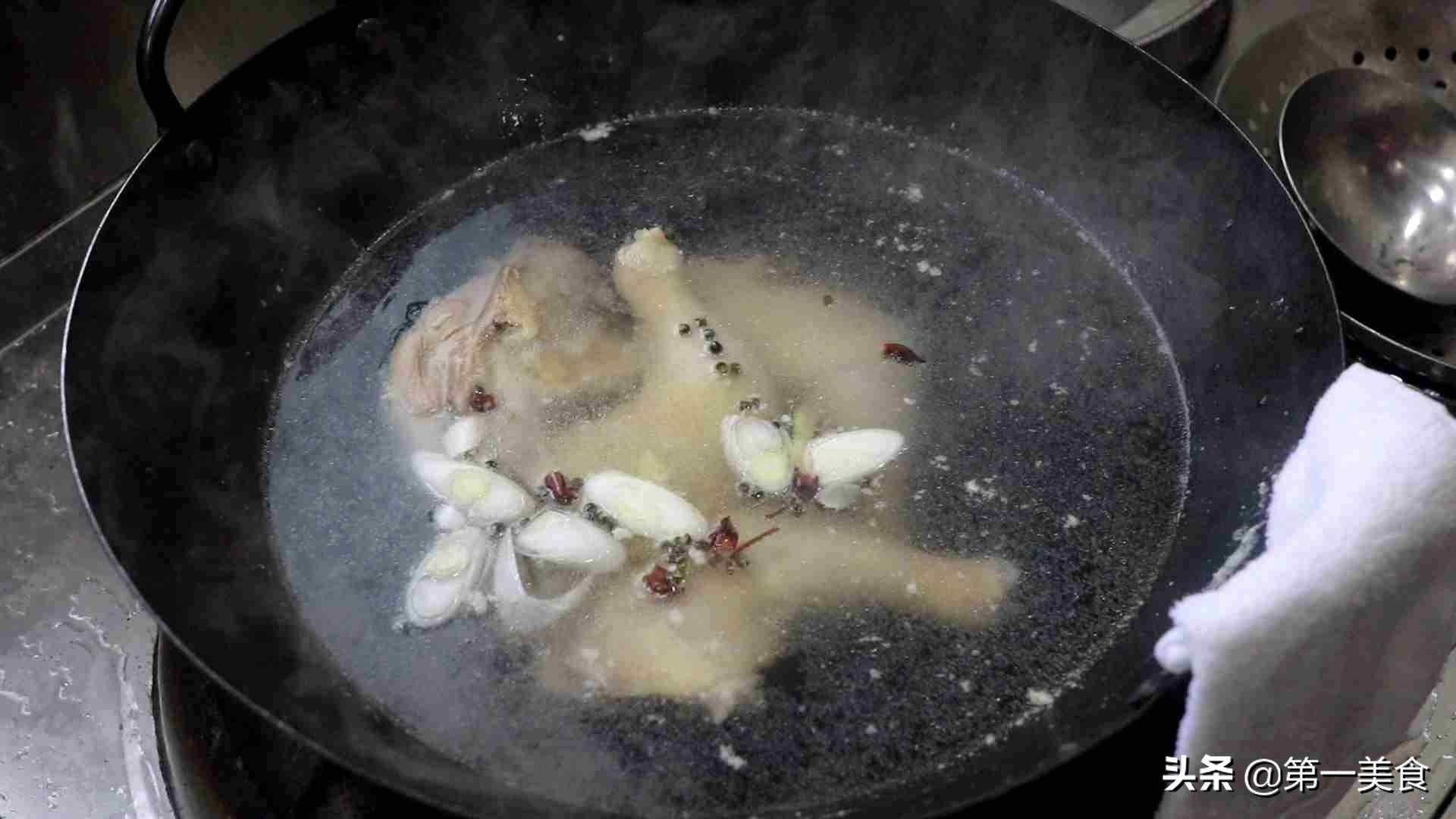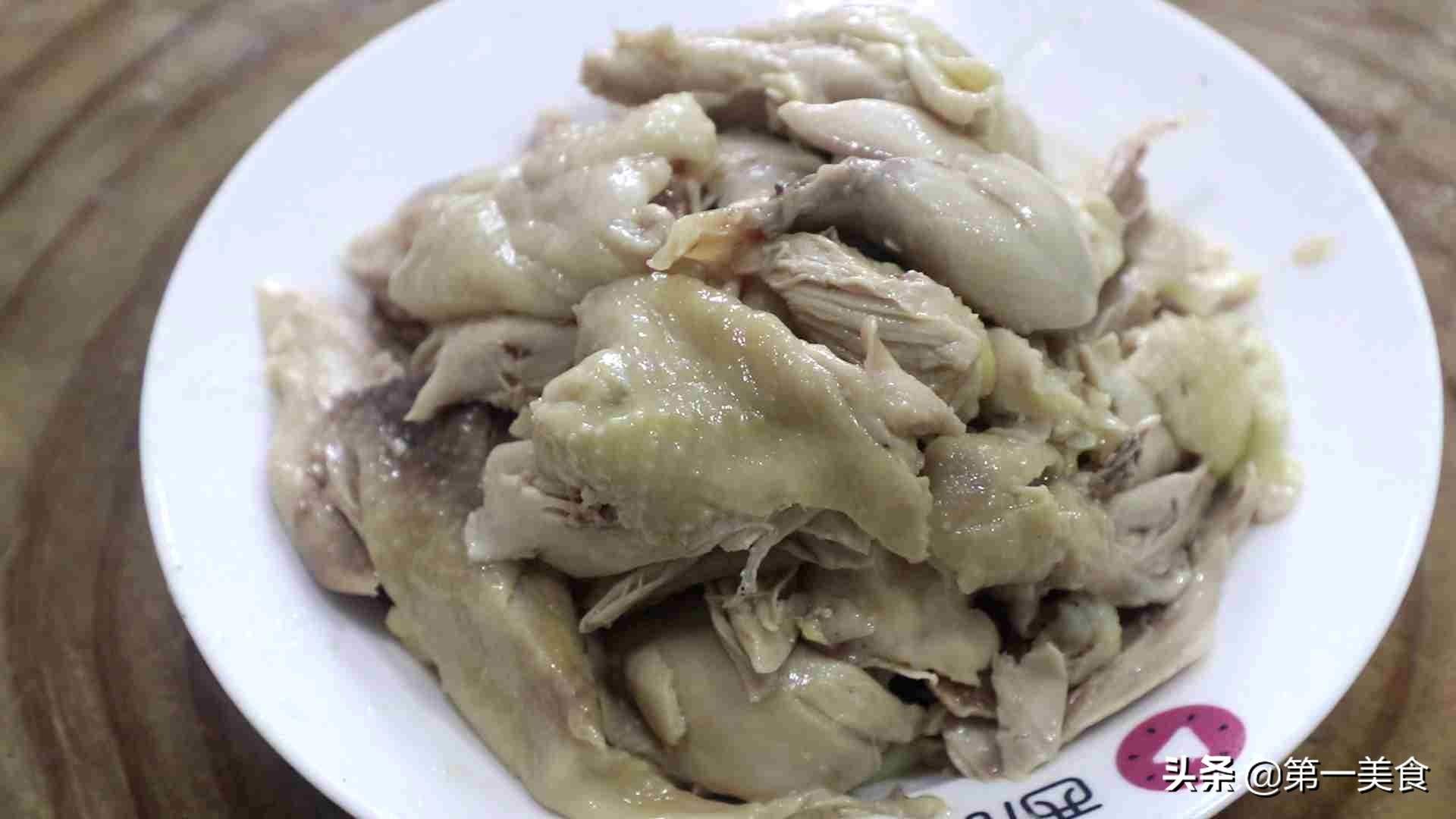 5.15分钟以后,鸡腿已经煮好,能用筷子轻轻的扎透,把鸡腿从锅中捞出冷却。然后把晾凉的鸡腿肉,撕成小块摆放在盘中备用。
