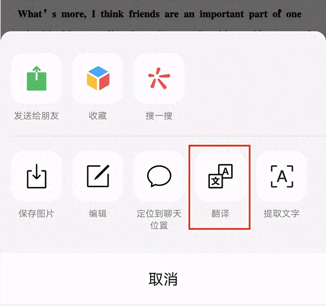 收到英文消息,不知道是什么意思,可以长按消息2秒时间,然后选择“翻译”,就会自动翻译完成。