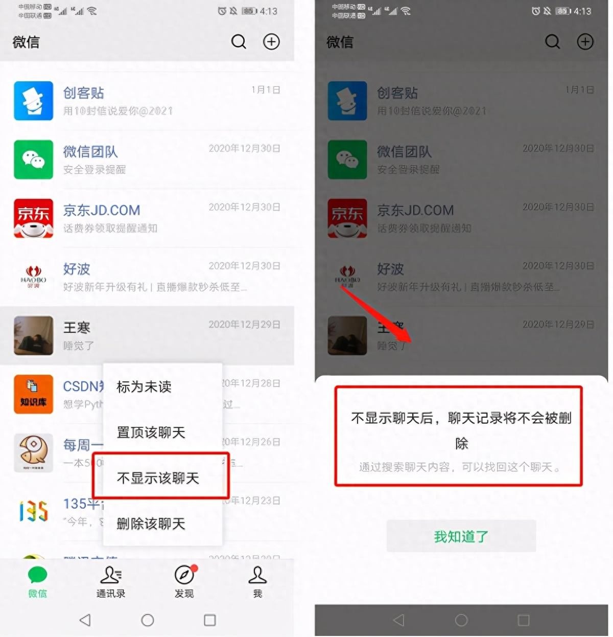 现在聊天记录可以恢复了,删除好友对话框的时候,长按2秒,选择“不显示该聊天”,这个对话框就不会在对话页面显示。再次点击,可以查看到原来的聊天记录。
