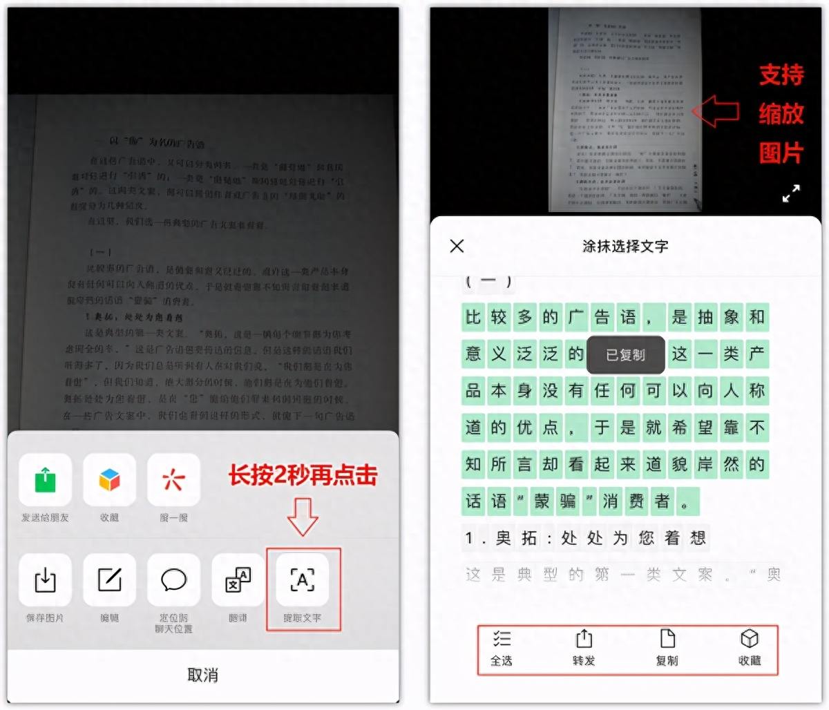 收到好友发来的图片,上面的文字想要摘录,但是一个个字的打出来很麻烦。可以直接长按图片2秒,选择“提取文字”,就能将文字提取出来。