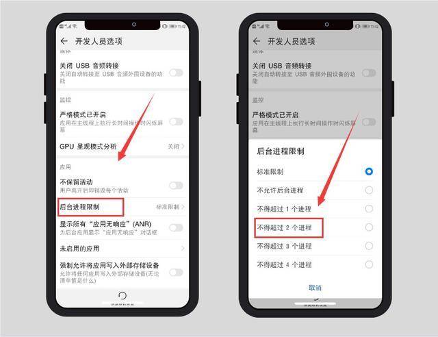 在【开发人员选项】中找到【后台进程限制】限制为不超过3个,让系统更流畅。