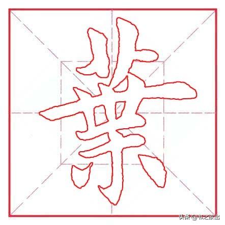 上部“草字头”整体紧凑,不要写散。左竖斜切起笔,向下略轻,勿长,右斜;左横勿重,抗肩,位置稍靠下,收笔藏于竖画;右边小横顺着左横的收笔方向起笔,不要写长,稍下压;右竖起笔稍高,与左竖呈合抱之势,略带撇意。