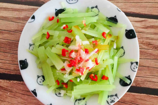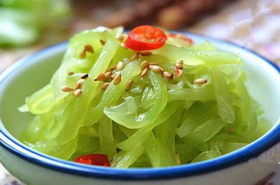 莴笋生吃的口感也会更加爽脆一些,将莴笋削皮切丝后可以放到凉开水中浸泡5~10分钟,然后捞出控干水分,加入食盐、酱油、醋、白糖、辣椒、蒜末等调料拌匀即可食用。