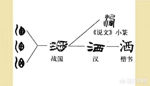 “酒”与“洒”看似只是一笔之差,其实二者并无关系,“酒”为会意兼形声。“洒”字本义为“洗涤”,与撒水、散开并无关系,后来“洒”本义为“洗”所取代后,便成为“灑”的简化字。“洒”字读音有六个之多,但常用的读音现在只有“sǎ”音。