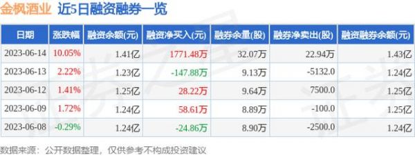 金枫酒业融资融券信息显示,融资方面,当日融资买入3903.43万元,融资偿还2131.95万元,融资净买入1771.48万元。融券方面,融券卖出25.62万股,融券偿还2.68万股,融券余量32.07万股,融券余额259.74万元。融资融券余额1.43亿元。近5日融资融券数据一览见下表: