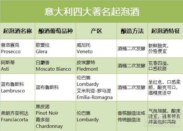 红酒世界网的《在气泡中体验意大利的浪漫》一文介绍了12种意大利起泡酒,有些比较常见,有些则听说不多。以下内容将为大家详细介绍意大利最主要的四类起泡酒。