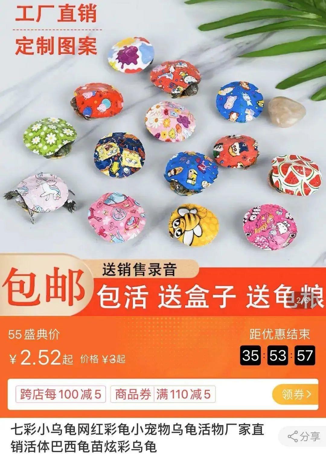 那为什么会有这种操作呢?在我小时候,也就是90年代的时候,红耳龟引进国内还没多久。物以稀为贵,一只刚出壳的幼龟能卖到10块钱左右——当年10块钱可是一笔巨款啊!后来随着养殖种群的扩大,巴西龟幼龟的价格现在已经跌到2~3元一只了,而且还卖不出去。但是经过魔改的巴西龟,能卖到十多块钱一只,这就给商人折腾小王八提供了动力。