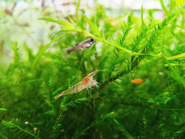 其次,我们在黑壳虾繁殖过程中减少换水造成水体动荡,更不要加入任何药物和其他影响水质的溶液。因为黑壳虾对水质变化也是比较敏感的,这也是为什么一开始要静待缸内滋生绿藻后才放入黑壳虾的原因,不稳定的水质不利于黑壳虾的繁殖。