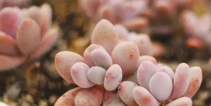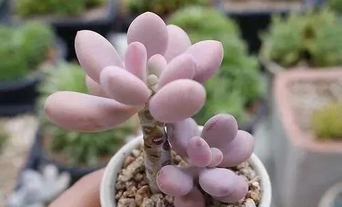 桃美人:姿色精致 桃美人在阳光充足、温差大的时候叶片会变成粉红色,远远看去像是一个个粉圆可人的小桃子,因此得名“桃美人”。这种多肉因为其小巧精致的美丽,很是受多肉植物爱好者的喜爱。桃美人的叶片有一层淡淡的白粉色,这就使得整个植物呈现出一种漂亮的淡紫或淡粉色,非常美丽,适合点缀在花园或是露台之中。