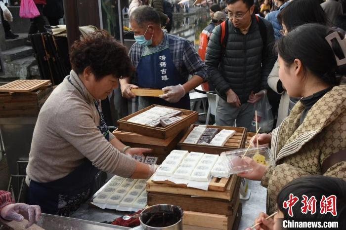 梁弄大糕吸引游人品尝。 中新网记者 范宇斌 摄