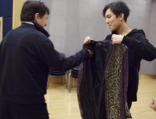 歌手迪玛希也是非常出名的。但是看看这张照片,居然亲自给成龙大哥穿衣服,就像是成龙大哥的小弟一般。