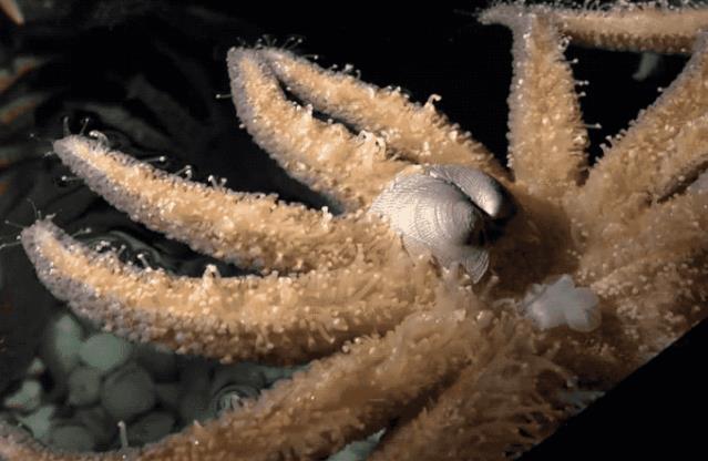 ,能够用腕足将扇贝包围,再用管足吸附住,然后拉开扇贝的外壳,将胃翻出消化扇贝壳内的柔软肉体。