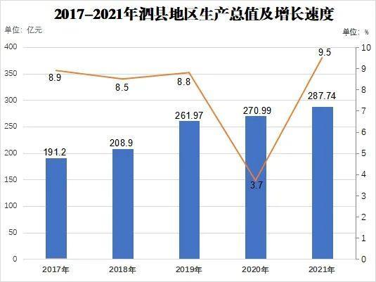 在过去几年里,泗县的GDP增长还算不错,2017-2021年过去5年,泗县的GDP分别为191.2亿元、208.9亿元、261.97亿元、270.99亿元、287.74亿元,增速分别为8.9%、8.5%、8.8%、3.7%、9.5%。