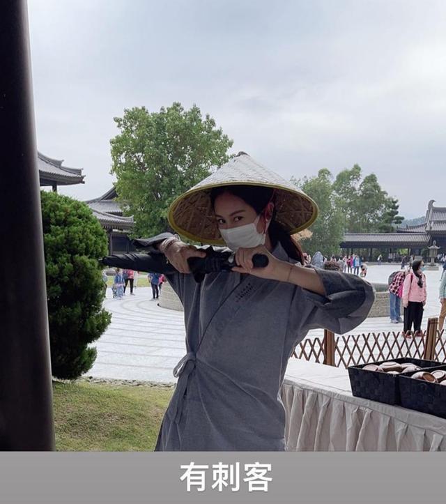 40岁的王秀琳仍然童心未泯,头上戴着斗笠帽,将雨伞当作剑拿在手上,摆出一幅拔剑比武的姿势,眼神十分犀利,颇有拍摄武侠大片的感觉。