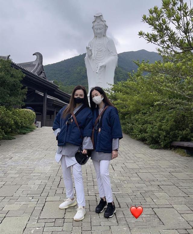 义工活动结束后,王秀琳与好友在观音像前合影,两人身材高挑,大长腿纤细吸睛,哪怕打扮朴素仍然有气质。