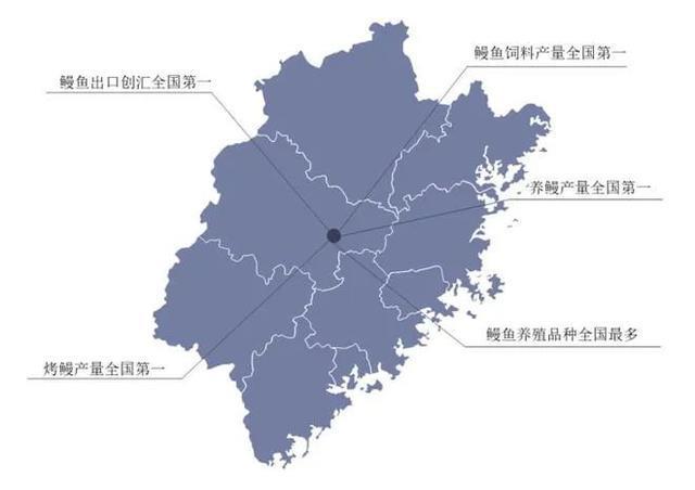福建鳗业养殖品种数量全国居首,包括日本鳗、花鳗、双色鳗等;养鳗产量全国第一;烤鳗产量全国第一;鳗鱼饲料产量全国第一,2020年达12.23万吨;鳗鱼出口创汇全国第一。福建省是我国最早开展鳗鱼养殖的省份之一,上世纪90年代就已经成为重点养鳗地区,并且相继成立县、市鳗业协会。