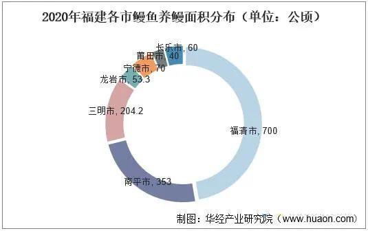 福建主要养鳗地区包括:福州市、福清市、南平市、三明市、龙岩市、宁德市、莆田市和长乐市等,大小养鳗场共约900家左右,养殖面积超2000公顷。福清市是福建省第一大产区,养鳗场408家,养殖面积700公顷。