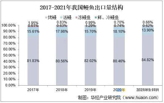 我国鳗鱼出口种类主要为烤鳗和活鳗,其中以烤鳗出口量最多。据统计,2020年我国烤鳗、活鳗出口量在鳗鱼出口总量中占比分别为84.82%、13.90%,两者合计超过98%,烤鳗和活鳗是我国鳗鱼出口的主要品类。