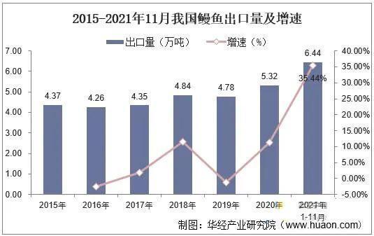 出口额方面,据统计,截至2021年1-11月我国鳗鱼出口创汇12.38亿美元,同比增长40.1%。