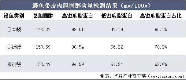 鳗鱼一般产于咸淡水交界海域,全世界鳗鱼共有日本鳗、欧洲鳗、美洲鳗等20多种,其中以日本鳗最多。鳗鱼具有较高的营养价值,中国农业科学院加工研究所实验结果显示,鳗鱼总胆固醇含量约为150mg/100g,与鳝鱼、鲫鱼等相似(120-130mg/100g),远远低于河虾、河蟹等,且被称为“血管清道夫”的高密度脂蛋白比例达到60.2%-66.1%,有利于人体心脑血管健康。