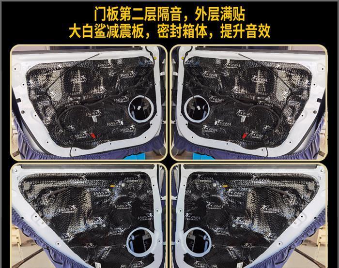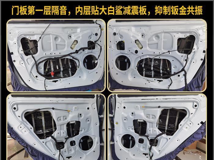 门板汽车隔音降噪第二层,门板外层满贴大白鲨减震板,使门板形成一个密闭的箱体空间,为音响提供有利的工作环境,也更有效的抑制门板的共振。