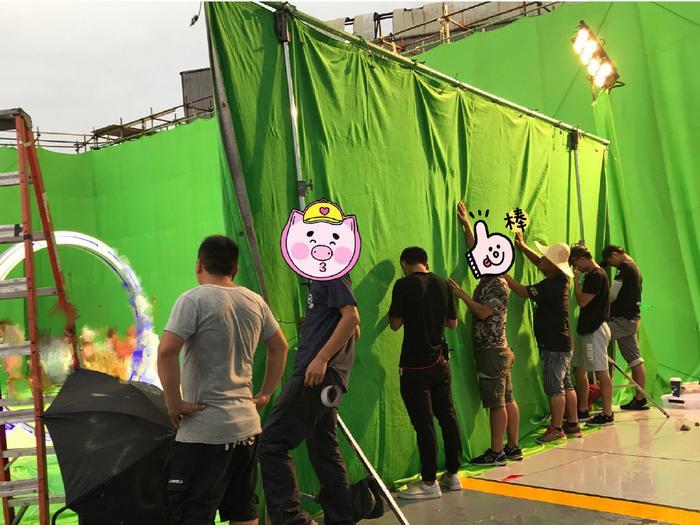 同时另外一个区域则放置满了绿幕,这意味着电影将做大量后期特效,省去了搭景的麻烦,并且,太空中的场景肯定也是要搭建绿幕并用特效完成。而中间围起来的部分,有一个带灯光的圆环,看上去很像是美人鱼的游玩乐园。