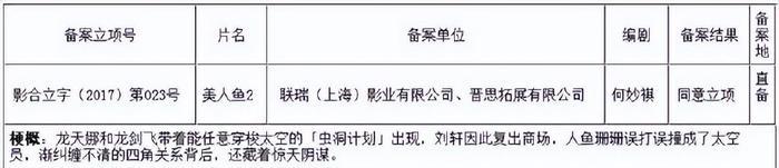 《美人鱼》票房大卖之后,2017年《美人鱼2》就立项了,从当时的立项通知来看,备案单位为联瑞影业,编剧是何妙祺,剧情梗概延续上一部,但也更加天马行空,龙天娜和龙剑飞带着能任意穿梭太空的“虫洞计划”出现,刘轩因此复出商场,人鱼珊珊误打误撞成了太空员,渐纠缠不清的四角关系背后,还藏着惊天阴谋。