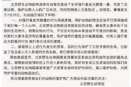 8月10日,北京野生动物园发表声明,证实有游客强行拿走天鹅蛋,经核实,事情发生于7月31日。