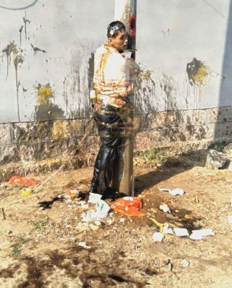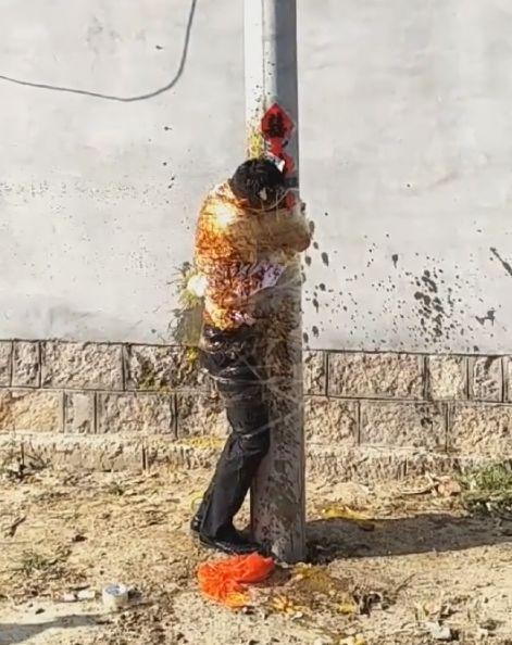 一群闹新郎的亲朋好友把新郎竟然绑在了电线杆子上,用胶带一圈一圈的给缠了起来,生怕新郎会逃跑。我开始以为这也还好,没有什么严重的,但是接下来发生的一幕着实让人看了气愤。只见新郎被捆的一动不动,不一会一群人就拿来酱油,醋,鸡蛋什么的开始往新郎身上扔过去,不一会新郎崭新的衣服就变得面目全非。