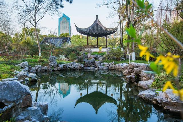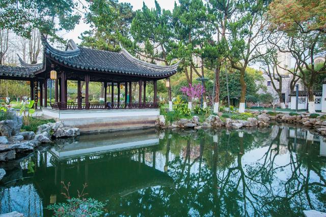 一池碧水微波荡漾,倒映着精巧秀气的凉亭,眼前的景色如春之画卷,满是绿色,满目生机。