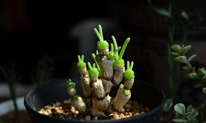 碧光环生长初期叶片较短,形似兔耳,随着植株生长而慢慢变长,待下一次休眠期再次枯萎。国内玩家所称的“长大后会徒长”是错误说法,其每年都会经历叶片由短到长的过程。