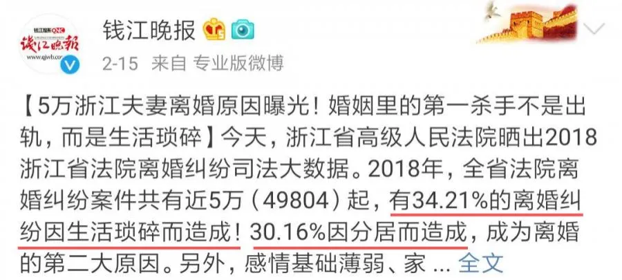 数据显示,在去年法院办理的5万起离婚纠纷案中,婚姻的第一杀手竟然不是老生常谈的出轨和家暴,而是生活琐事!