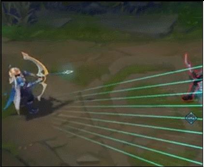 艾希朝空中射出一箭,转身端坐王座,随后射出的箭分裂成八支落在王座上。