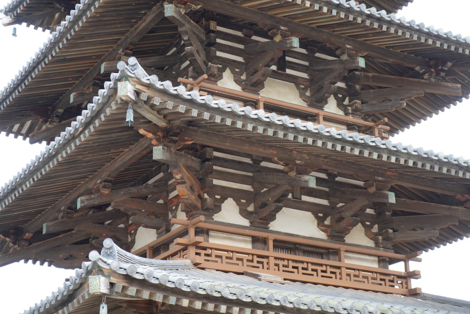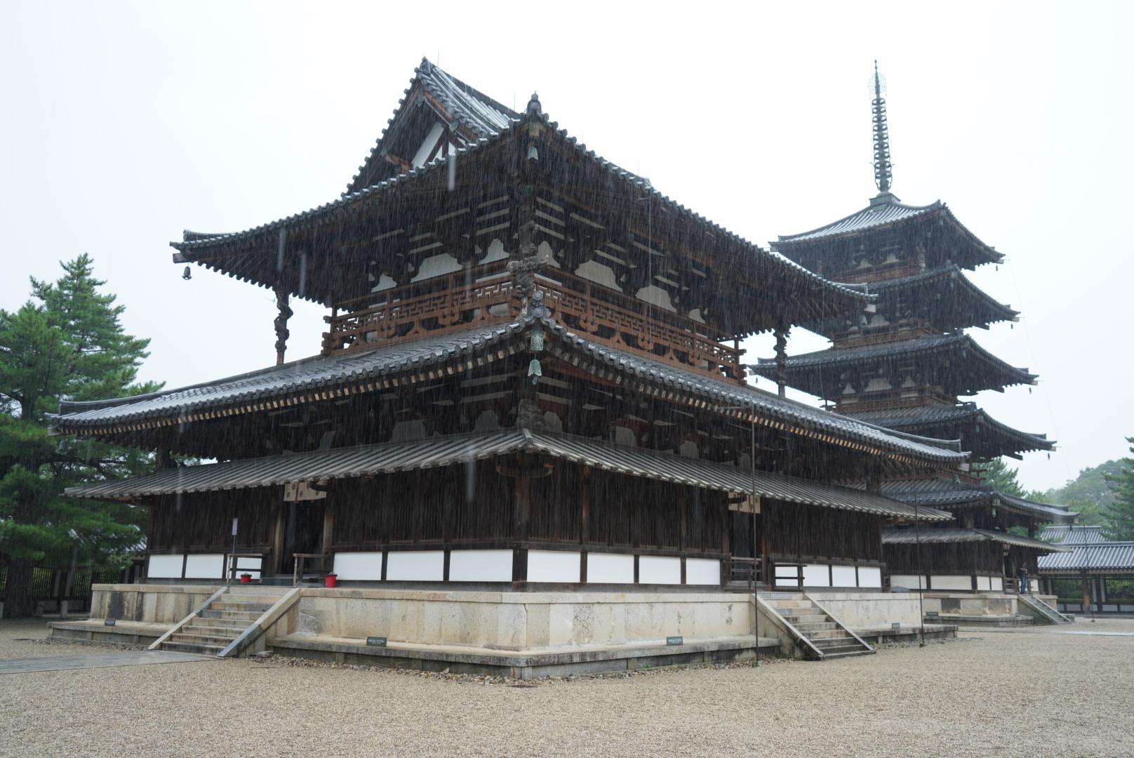 五重塔建于飞鸟时代,为日本最古老五重塔,底层有奈良时代塑像群;