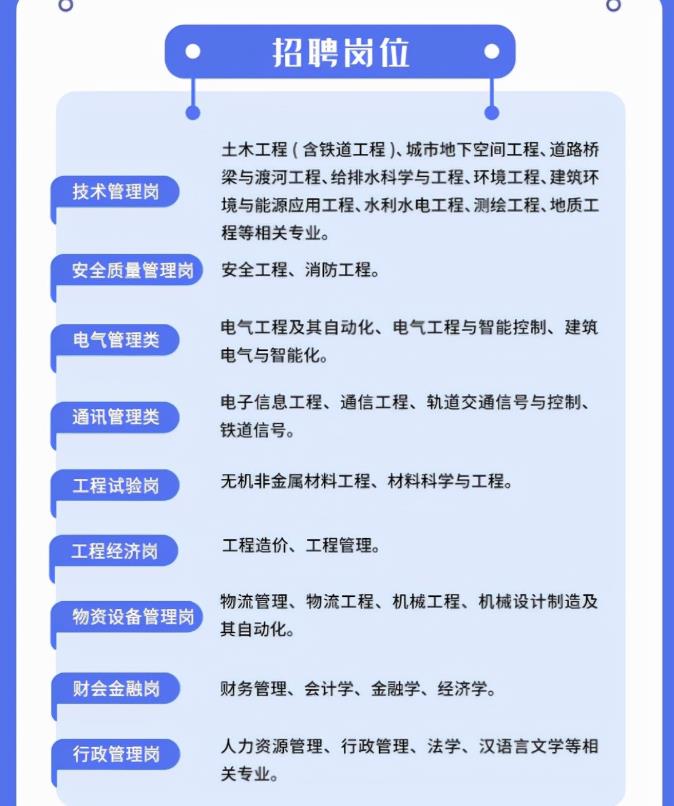福利待遇好,提供的岗位也很多,9大岗位供学生们选择,像技术岗位,土木工程专业的学生可以报考,还有电气管理类的岗位,通讯管理、工程试验,财会金融等,中铁一局的招聘,在全国多个地区进行,应届的本科生和硕士生不要错过好机会。