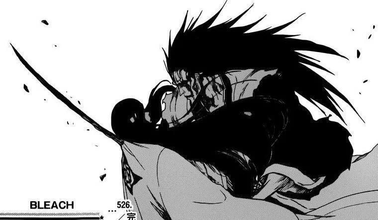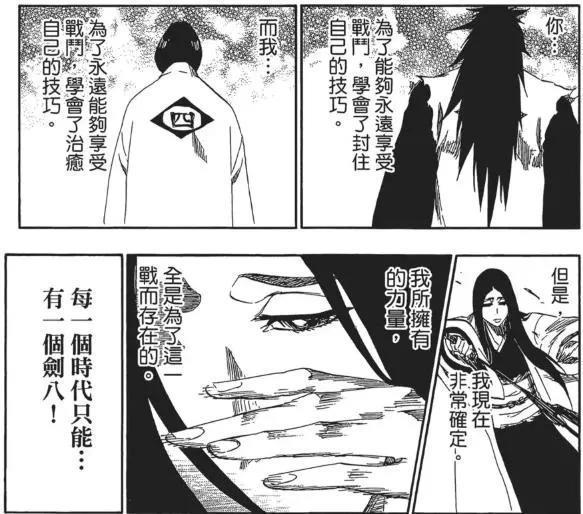 在战斗中使出卍解“皆尽”,为了同一个时代不能存在两位剑八的理念,让更木剑八刺中当年的伤口而死。