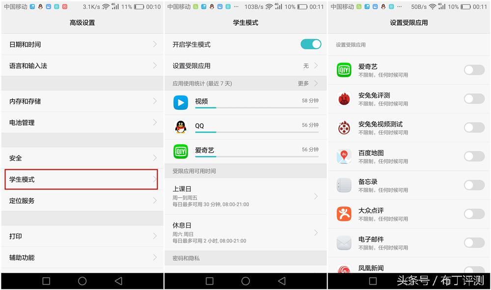 系统中还有个专门的“学生模式”,这个对于家中的熊孩子们还是很有用处的,可以直接通过设置界面中的“高级设置”选项开启,开启之后就可以进行“设置受限应用”和“受限应有可用时间”,到了设定时间之后,应用就会别锁定无法使用。