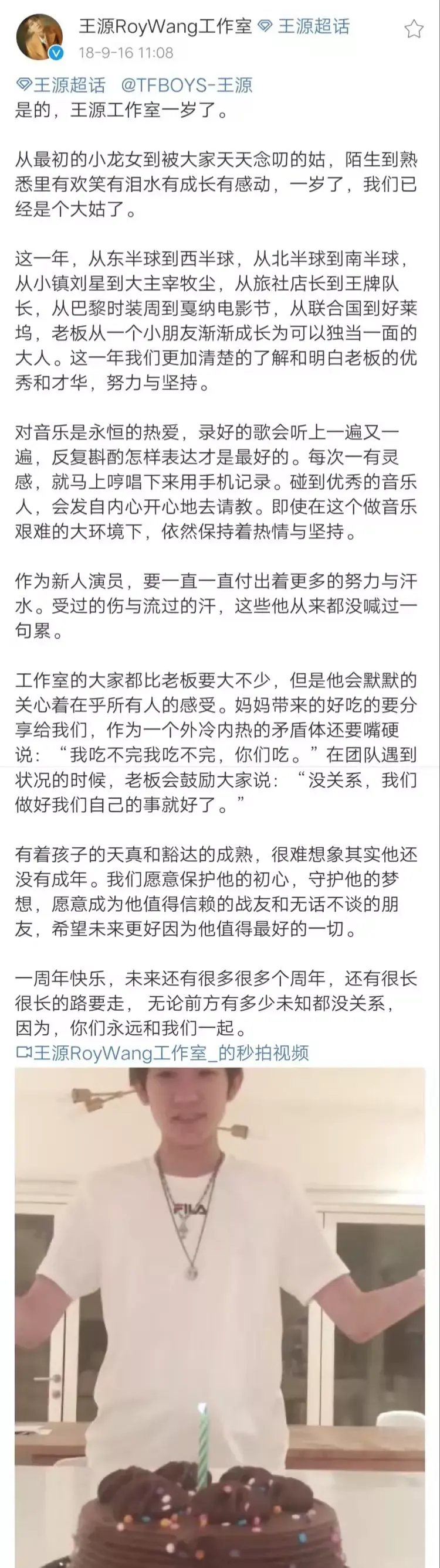 2018年9月16日工作室一岁了。这一年,从东半球到西半球,从北半球到南半球,从小镇刘星到大主宰牧尘,从旅社店长到王牌队长,从巴黎时装周到戛纳电影节,从联合国到好莱坞,王源和工作室都进行了一场新的蜕变。私下里,王源和工作室打打闹闹,工作上,互相帮助,加油打气。