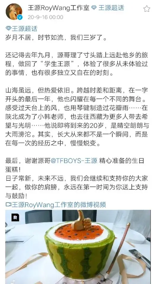 2020年9月16日工作室三岁了。这一年,王源理了寸头踏上远赴他乡的旅程,做回了“学生王源”,体验了很多从未体验过的事情,也有很多独立又自在的时刻。山海虽远,但热爱依旧。跨越时差和距离,在一字开头的最后一年,他也闪耀在每一个不同的舞台。感受过天台上的风,也用琴键制造过花瓣雨……在陕北成为了小韩老师,也去往西藏为更多人带去希望与光明……王源惊人的成绩下也有着工作人员的倾情付出,谢谢工作室。
