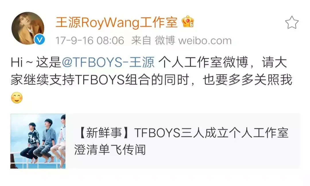 2017年9月16日出生的工作室,有着和王源一样的稚嫩青涩,也许不够熟练,也许惴惴不安,但却是一个新的开始,就像幼儿,在跌跌撞撞向前走。从此,粉丝,王源,工作室,三者密不可分,互为支撑,共同开启一段新的旅程。
