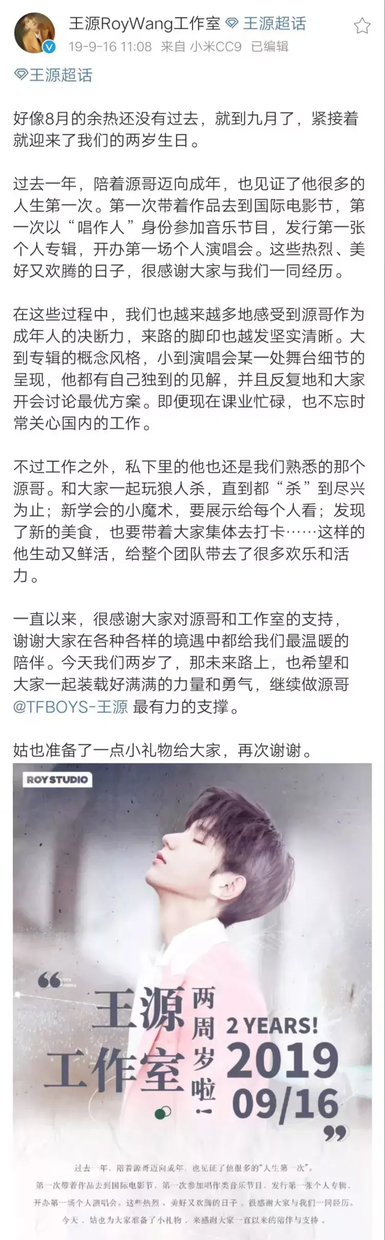 2019年9月16日工作室两岁了。过去一年,工作室陪着王源迈向成年,也见证了他很多的人生第一次。第一次带着作品去到国际电影节,第一次以“唱作人”身份参加音乐节目,发行第一张个人专辑,开办第一场个人演唱会。这些热烈、美好又欢腾的日子,足够让所有人铭记。