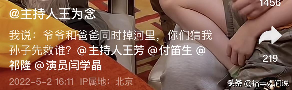 5月2号,王为念罕有分享一家三代温馨同框的画面,并在留言处说道:爷爷和爸爸同时掉河里,你们猜我孙子先救谁?
