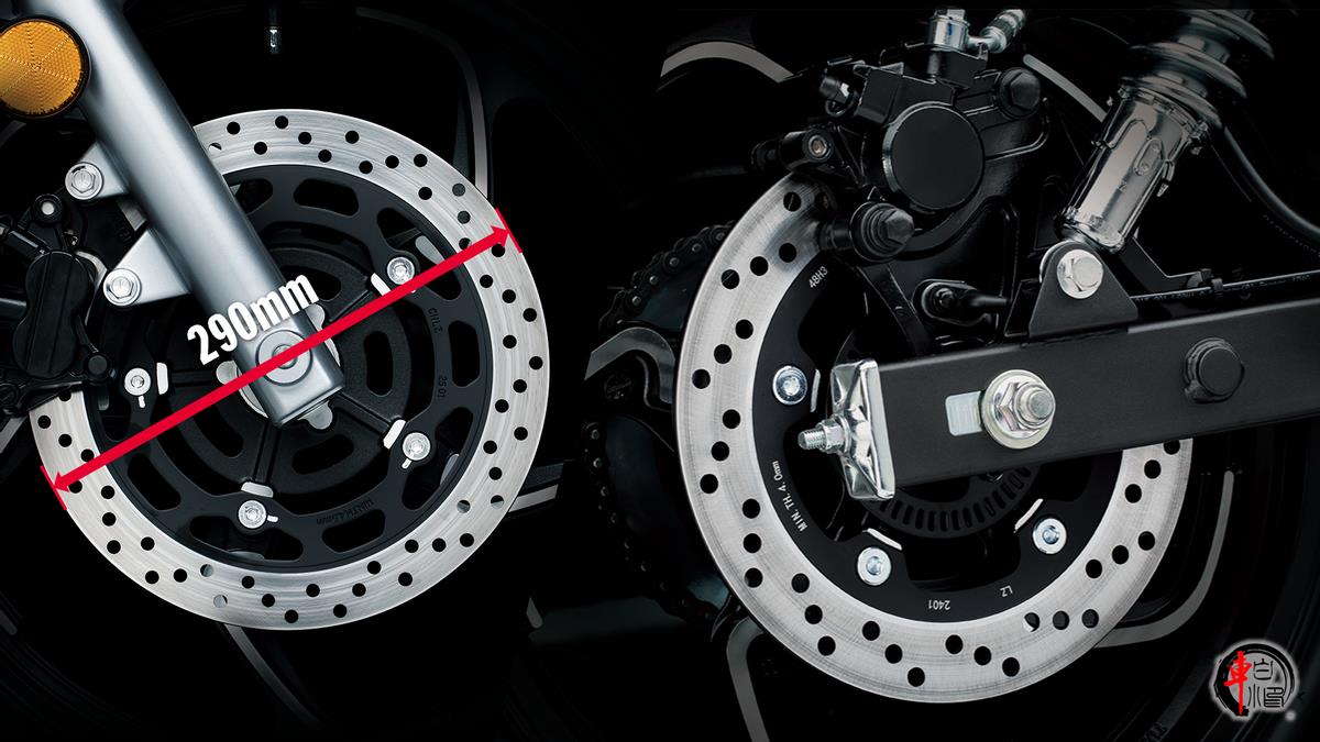 硬件方面,减震系统采用伸缩式正置前叉,搭配液压阻尼双后减震。刹车系统得到提升,采用了前后盘刹,比上代车型的前盘后鼓,制动力明显提升。并且也升级了后轮胎尺寸,对后轮防滑起到一定提升作用。