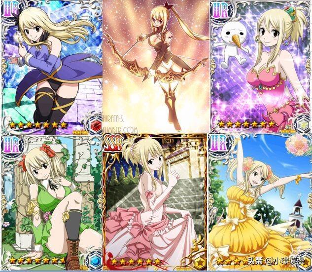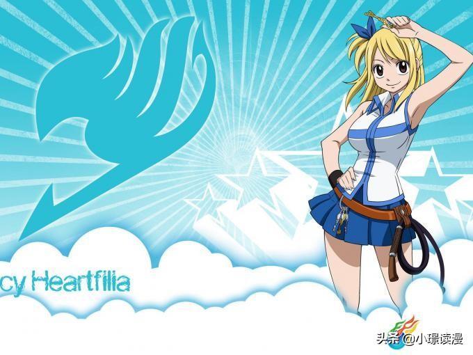 露西·哈特菲利亚,妖精的尾巴女主角,有着一头美丽的金发和貌美的容貌,窈窕的身材在妖精尾巴的众多女性成员中相当突出,曾经在动画原创剧情中因换魂魔法的影响跟格雷对调过身体,被格雷吐槽说她胸部很重,让他腰酸背痛。擅长吐槽,性格活泼开朗、非常重视伙伴和公会成员。在公会论美貌排名小编任何起码也是前三的存在。在公会里经常和艾露莎、米拉杰等美女一起被其他公会男成员拿来比较与吐槽,也是公会众多男生追求的对象。露西的常态装扮一般是蓝白无袖T加蓝色超短裙,腰间配有皮鞭作为露西的常用武器。其他不同的时候有这各种各样的服装,数都数不过来。